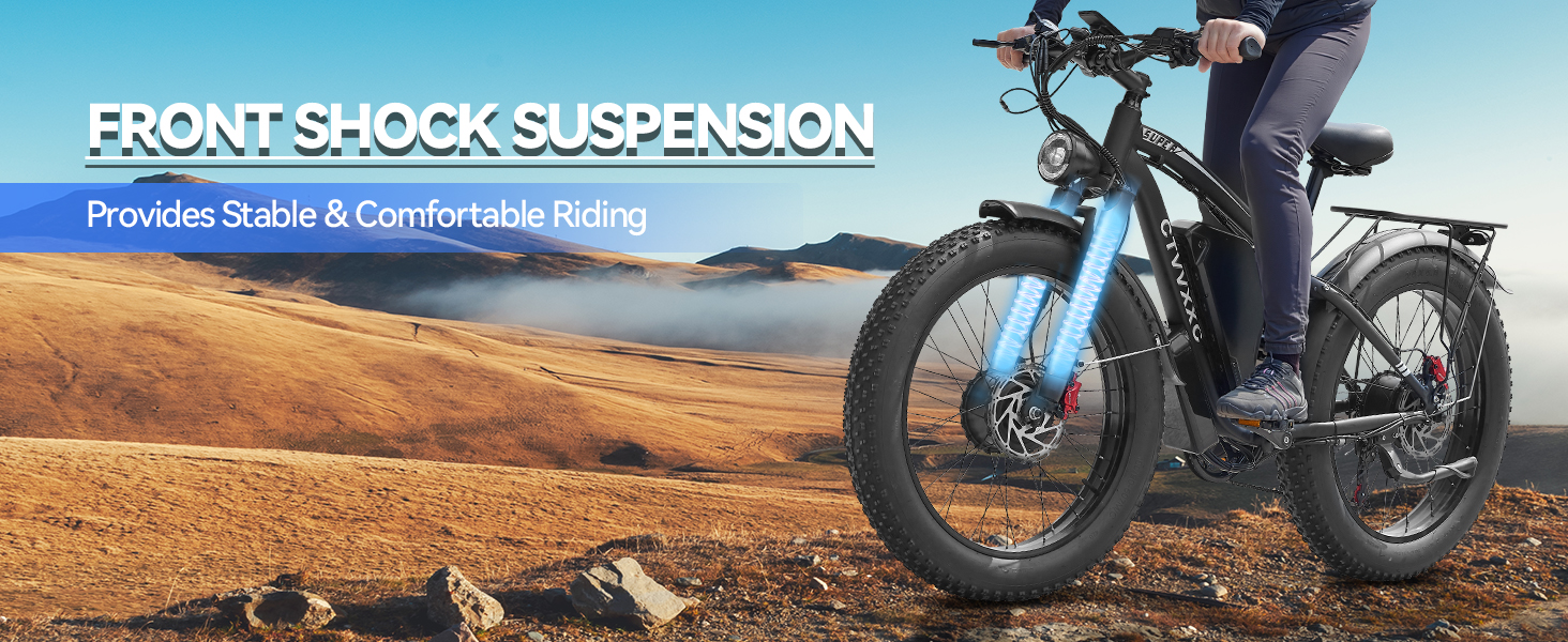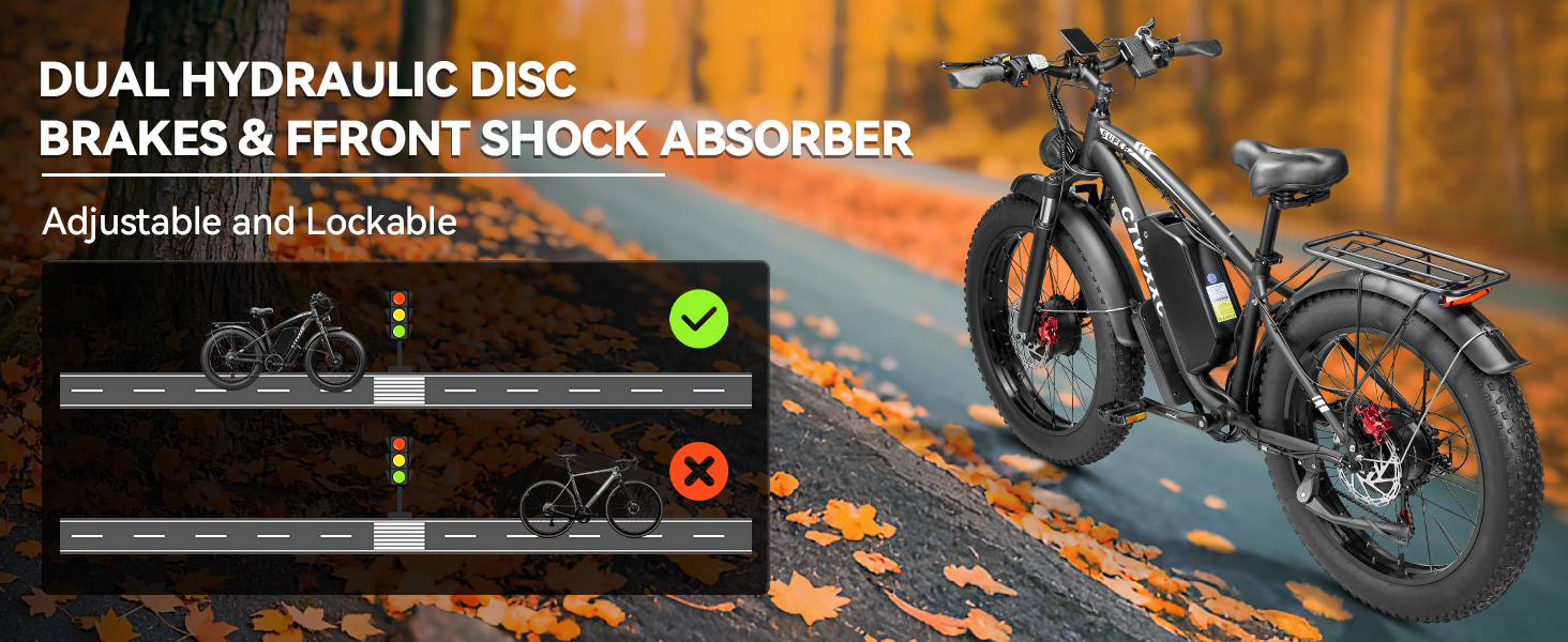- 【Hydraulic Disc Brakes】The front and rear hydraulic brake system with power-off function offers an easy brake within 2 seconds, which provide more effective braking in rainy weather, heavy off-road, long downhill, high-speed riding and adverse conditions, stop the e-bike quickly and smoothly. The lockable aluminum suspension front fork has a good shock absorption effect, which can offer you safer and comfortable riding experience